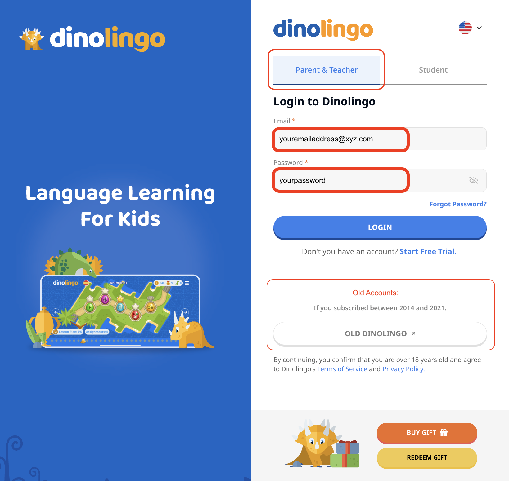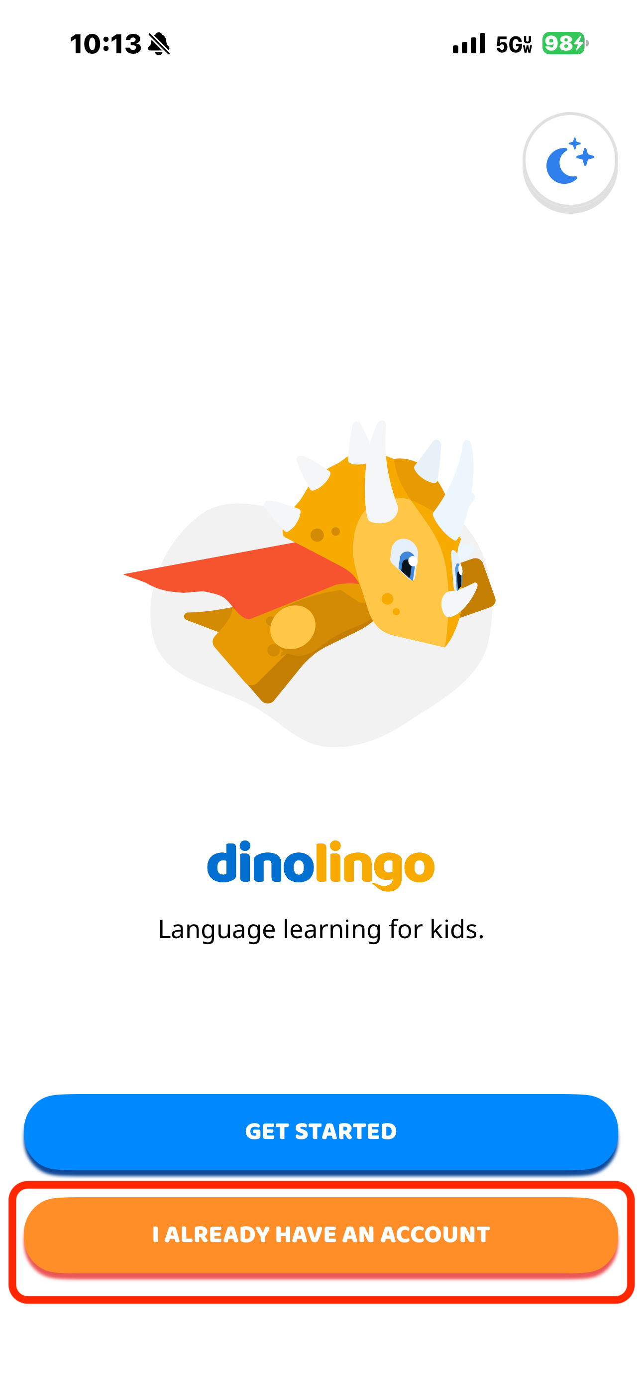 Download the Dinolingo app, open it, and select “I already have an account.”.